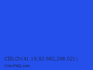 CIELCh 41.19,92.682,298.021 Color is a normal blue color and the nearest color is Palatinate Blue #273be2. Hex code #254feb and RGB value is rgb(37,79,235). In RGB color space, this color is composed of 15% red, 31% green, 92% blue, In CMYK color space, this color is composed of 84% cyan, 66% magenta, 0% yellow , 8% black , In HSL color space, this color has a hue angle of 227° , 83% saturation and 53% lightness.
