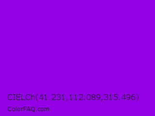 CIELCh 41.231,112.089,315.496 Color is a normal purple color and the nearest color is Dark Violet #9400d3. Hex code #9400e6 and RGB value is rgb(148,0,230). In RGB color space, this color is composed of 58% red, 0% green, 90% blue, In CMYK color space, this color is composed of 36% cyan, 100% magenta, 0% yellow , 10% black , In HSL color space, this color has a hue angle of 279° , 100% saturation and 45% lightness.