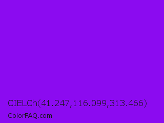 CIELCh 41.247,116.099,313.466 Color is a normal purple color and the nearest color is Electric Violet #8b00ff. Hex code #8b0bf0 and RGB value is rgb(139,11,240). In RGB color space, this color is composed of 55% red, 4% green, 94% blue, In CMYK color space, this color is composed of 42% cyan, 95% magenta, 0% yellow , 6% black , In HSL color space, this color has a hue angle of 274° , 91% saturation and 49% lightness.