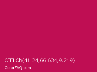 CIELCh 41.24,66.634,9.219 Color is a normal rose color and the nearest color is Pictorial Carmine #c30b4e. Hex code #bf0e53 and RGB value is rgb(191,14,83). In RGB color space, this color is composed of 75% red, 5% green, 33% blue, In CMYK color space, this color is composed of 0% cyan, 93% magenta, 57% yellow , 25% black , In HSL color space, this color has a hue angle of 337° , 86% saturation and 40% lightness.