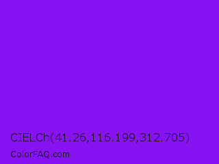 CIELCh 41.26,116.199,312.705 Color is a normal purple color and the nearest color is Electric Violet #8b00ff. Hex code #8713f2 and RGB value is rgb(135,19,242). In RGB color space, this color is composed of 53% red, 7% green, 95% blue, In CMYK color space, this color is composed of 44% cyan, 92% magenta, 0% yellow , 5% black , In HSL color space, this color has a hue angle of 271° , 90% saturation and 51% lightness.