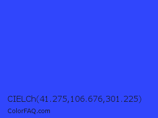 CIELCh 41.275,106.676,301.225 Color is a normal blue color and the nearest color is Palatinate Blue #273be2. Hex code #3046fc and RGB value is rgb(48,70,252). In RGB color space, this color is composed of 19% red, 27% green, 99% blue, In CMYK color space, this color is composed of 81% cyan, 72% magenta, 0% yellow , 1% black , In HSL color space, this color has a hue angle of 234° , 97% saturation and 59% lightness.