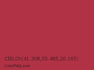 CIELCh 41.308,55.485,20.165 Color is a normal red color and the nearest color is Amaranth Purple #ab274f. Hex code #b13245 and RGB value is rgb(177,50,69). In RGB color space, this color is composed of 69% red, 20% green, 27% blue, In CMYK color space, this color is composed of 0% cyan, 72% magenta, 61% yellow , 31% black , In HSL color space, this color has a hue angle of 351° , 56% saturation and 45% lightness.