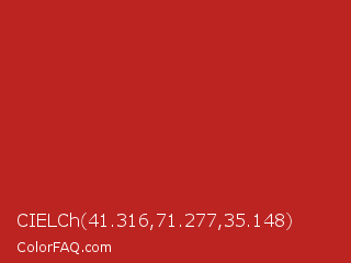 CIELCh 41.316,71.277,35.148 Color is a normal red color and the nearest color is Firebrick #b22222. Hex code #bc2421 and RGB value is rgb(188,36,33). In RGB color space, this color is composed of 74% red, 14% green, 13% blue, In CMYK color space, this color is composed of 0% cyan, 81% magenta, 82% yellow , 26% black , In HSL color space, this color has a hue angle of 1° , 70% saturation and 43% lightness.