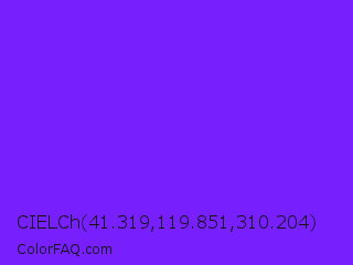 CIELCh 41.319,119.851,310.204 Color is a normal violet color and the nearest color is Violet Color Wheel #7f00ff. Hex code #781ffd and RGB value is rgb(120,31,253). In RGB color space, this color is composed of 47% red, 12% green, 99% blue, In CMYK color space, this color is composed of 53% cyan, 88% magenta, 0% yellow , 1% black , In HSL color space, this color has a hue angle of 264° , 98% saturation and 56% lightness.