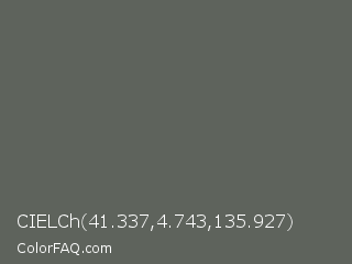 CIELCh 41.337,4.743,135.927 Color is a normal green color and the nearest color is Chicago #5d5c58. Hex code #5e635c and RGB value is rgb(94,99,92). In RGB color space, this color is composed of 37% red, 39% green, 36% blue, In CMYK color space, this color is composed of 5% cyan, 0% magenta, 7% yellow , 61% black , In HSL color space, this color has a hue angle of 103° , 4% saturation and 37% lightness.