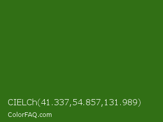 CIELCh 41.337,54.857,131.989 Color is a dark green color and the nearest color is Bilbao #327c14. Hex code #316f15 and RGB value is rgb(49,111,21). In RGB color space, this color is composed of 19% red, 44% green, 8% blue, In CMYK color space, this color is composed of 56% cyan, 0% magenta, 81% yellow , 56% black , In HSL color space, this color has a hue angle of 101° , 68% saturation and 26% lightness.