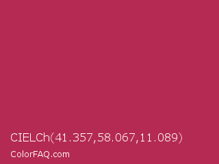CIELCh 41.357,58.067,11.089 Color is a normal rose color and the nearest color is Amaranth Purple #ab274f. Hex code #b52a52 and RGB value is rgb(181,42,82). In RGB color space, this color is composed of 71% red, 16% green, 32% blue, In CMYK color space, this color is composed of 0% cyan, 77% magenta, 55% yellow , 29% black , In HSL color space, this color has a hue angle of 343° , 62% saturation and 44% lightness.