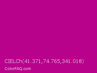CIELCh 41.371,74.765,341.018 Color is a normal magenta color and the nearest color is Red Violet #c71585. Hex code #b8028b and RGB value is rgb(184,2,139). In RGB color space, this color is composed of 72% red, 1% green, 55% blue, In CMYK color space, this color is composed of 0% cyan, 99% magenta, 24% yellow , 28% black , In HSL color space, this color has a hue angle of 315° , 98% saturation and 36% lightness.
