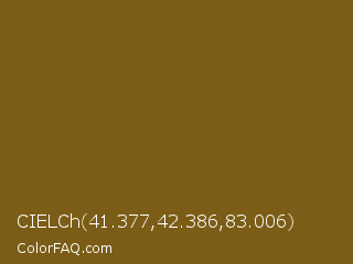 CIELCh 41.377,42.386,83.006 Color is a dark orange color and the nearest color is Grizzly #885818. Hex code #7b5d17 and RGB value is rgb(123,93,23). In RGB color space, this color is composed of 48% red, 36% green, 9% blue, In CMYK color space, this color is composed of 0% cyan, 24% magenta, 81% yellow , 52% black , In HSL color space, this color has a hue angle of 42° , 68% saturation and 29% lightness.