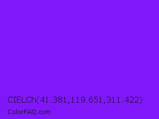 CIELCh 41.381,119.651,311.422 Color is a normal violet color and the nearest color is Violet Color Wheel #7f00ff. Hex code #8017fa and RGB value is rgb(128,23,250). In RGB color space, this color is composed of 50% red, 9% green, 98% blue, In CMYK color space, this color is composed of 49% cyan, 91% magenta, 0% yellow , 2% black , In HSL color space, this color has a hue angle of 268° , 96% saturation and 54% lightness.