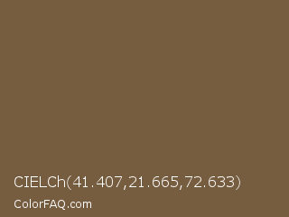 CIELCh 41.407,21.665,72.633 Color is a normal orange color and the nearest color is Tobacco Brown #715d47. Hex code #775d40 and RGB value is rgb(119,93,64). In RGB color space, this color is composed of 47% red, 36% green, 25% blue, In CMYK color space, this color is composed of 0% cyan, 22% magenta, 46% yellow , 53% black , In HSL color space, this color has a hue angle of 32° , 30% saturation and 36% lightness.