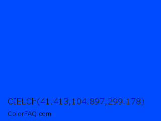 CIELCh 41.413,104.897,299.178 Color is a normal blue color and the nearest color is Blue RYB #0247fe. Hex code #004bfd and RGB value is rgb(0,75,253). In RGB color space, this color is composed of 0% red, 29% green, 99% blue, In CMYK color space, this color is composed of 100% cyan, 70% magenta, 0% yellow , 1% black , In HSL color space, this color has a hue angle of 222° , 100% saturation and 50% lightness.