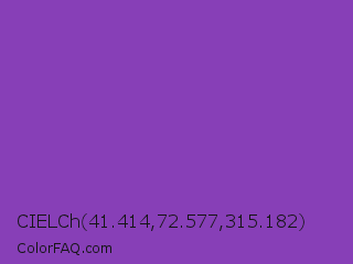 CIELCh 41.414,72.577,315.182 Color is a normal purple color and the nearest color is Studio #714ab2. Hex code #873fb7 and RGB value is rgb(135,63,183). In RGB color space, this color is composed of 53% red, 25% green, 72% blue, In CMYK color space, this color is composed of 26% cyan, 66% magenta, 0% yellow , 28% black , In HSL color space, this color has a hue angle of 276° , 49% saturation and 48% lightness.