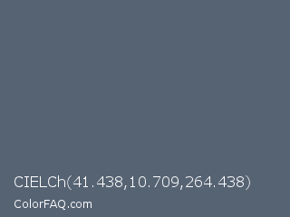 CIELCh 41.438,10.709,264.438 Color is a normal blue color and the nearest color is Black Coral #54626f. Hex code #566373 and RGB value is rgb(86,99,115). In RGB color space, this color is composed of 34% red, 39% green, 45% blue, In CMYK color space, this color is composed of 25% cyan, 14% magenta, 0% yellow , 55% black , In HSL color space, this color has a hue angle of 213° , 14% saturation and 39% lightness.