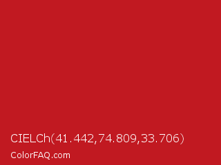 CIELCh 41.442,74.809,33.706 Color is a normal red color and the nearest color is Carnelian #b31b1b. Hex code #c11921 and RGB value is rgb(193,25,33). In RGB color space, this color is composed of 76% red, 10% green, 13% blue, In CMYK color space, this color is composed of 0% cyan, 87% magenta, 83% yellow , 24% black , In HSL color space, this color has a hue angle of 357° , 77% saturation and 43% lightness.