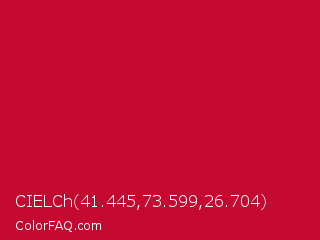 CIELCh 41.445,73.599,26.704 Color is a normal red color and the nearest color is Red NCS #c40233. Hex code #c40930 and RGB value is rgb(196,9,48). In RGB color space, this color is composed of 77% red, 4% green, 19% blue, In CMYK color space, this color is composed of 0% cyan, 95% magenta, 76% yellow , 23% black , In HSL color space, this color has a hue angle of 347° , 91% saturation and 40% lightness.