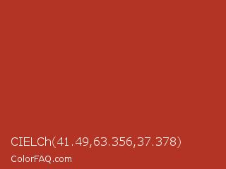 CIELCh 41.49,63.356,37.378 Color is a normal red color and the nearest color is Tall Poppy #b32d29. Hex code #b33425 and RGB value is rgb(179,52,37). In RGB color space, this color is composed of 70% red, 20% green, 15% blue, In CMYK color space, this color is composed of 0% cyan, 71% magenta, 79% yellow , 30% black , In HSL color space, this color has a hue angle of 6° , 66% saturation and 42% lightness.