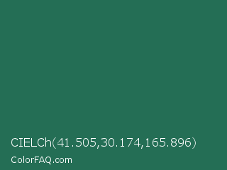 CIELCh 41.505,30.174,165.896 Color is a dark green color and the nearest color is Dark Spring Green #177245. Hex code #246e55 and RGB value is rgb(36,110,85). In RGB color space, this color is composed of 14% red, 43% green, 33% blue, In CMYK color space, this color is composed of 67% cyan, 0% magenta, 23% yellow , 57% black , In HSL color space, this color has a hue angle of 160° , 51% saturation and 29% lightness.