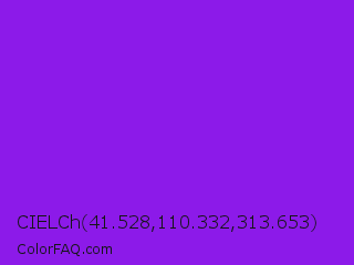 CIELCh 41.528,110.332,313.653 Color is a normal purple color and the nearest color is Blue Violet #8a2be2. Hex code #8c1ae9 and RGB value is rgb(140,26,233). In RGB color space, this color is composed of 55% red, 10% green, 91% blue, In CMYK color space, this color is composed of 40% cyan, 89% magenta, 0% yellow , 9% black , In HSL color space, this color has a hue angle of 273° , 82% saturation and 51% lightness.