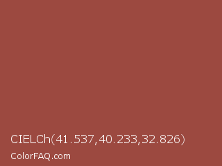 CIELCh 41.537,40.233,32.826 Color is a normal red color and the nearest color is Copper Rust #944747. Hex code #9c4940 and RGB value is rgb(156,73,64). In RGB color space, this color is composed of 61% red, 29% green, 25% blue, In CMYK color space, this color is composed of 0% cyan, 53% magenta, 59% yellow , 39% black , In HSL color space, this color has a hue angle of 6° , 42% saturation and 43% lightness.