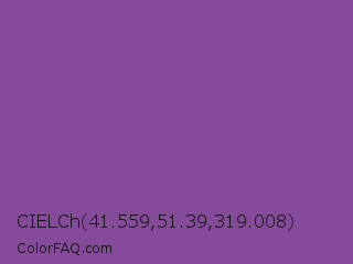 CIELCh 41.559,51.39,319.008 Color is a normal purple color and the nearest color is Dark Lavender #734f96. Hex code #854a9a and RGB value is rgb(133,74,154). In RGB color space, this color is composed of 52% red, 29% green, 60% blue, In CMYK color space, this color is composed of 14% cyan, 52% magenta, 0% yellow , 40% black , In HSL color space, this color has a hue angle of 284° , 35% saturation and 45% lightness.