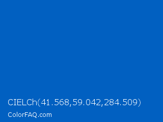 CIELCh 41.568,59.042,284.509 Color is a normal blue color and the nearest color is Science Blue #0066cc. Hex code #0160c1 and RGB value is rgb(1,96,193). In RGB color space, this color is composed of 0% red, 38% green, 76% blue, In CMYK color space, this color is composed of 99% cyan, 50% magenta, 0% yellow , 24% black , In HSL color space, this color has a hue angle of 210° , 99% saturation and 38% lightness.