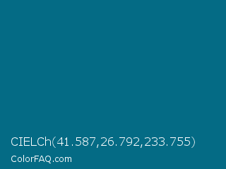 CIELCh 41.587,26.792,233.755 Color is a dark cyan color and the nearest color is Orient #015e85. Hex code #046b85 and RGB value is rgb(4,107,133). In RGB color space, this color is composed of 2% red, 42% green, 52% blue, In CMYK color space, this color is composed of 97% cyan, 20% magenta, 0% yellow , 48% black , In HSL color space, this color has a hue angle of 192° , 94% saturation and 27% lightness.