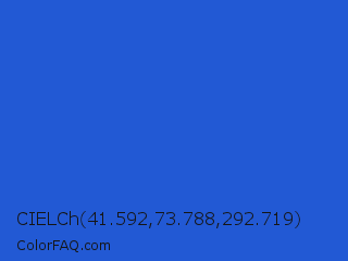 CIELCh 41.592,73.788,292.719 Color is a normal blue color and the nearest color is New Car #214fc6. Hex code #2259d4 and RGB value is rgb(34,89,212). In RGB color space, this color is composed of 13% red, 35% green, 83% blue, In CMYK color space, this color is composed of 84% cyan, 58% magenta, 0% yellow , 17% black , In HSL color space, this color has a hue angle of 221° , 72% saturation and 48% lightness.