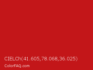 CIELCh 41.605,78.068,36.025 Color is a normal red color and the nearest color is Lava #cf1020. Hex code #c31619 and RGB value is rgb(195,22,25). In RGB color space, this color is composed of 76% red, 9% green, 10% blue, In CMYK color space, this color is composed of 0% cyan, 89% magenta, 87% yellow , 24% black , In HSL color space, this color has a hue angle of 359° , 80% saturation and 43% lightness.
