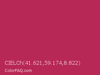 CIELCh 41.621,59.174,8.822 Color is a normal rose color and the nearest color is Amaranth Purple #ab274f. Hex code #b72856 and RGB value is rgb(183,40,86). In RGB color space, this color is composed of 72% red, 16% green, 34% blue, In CMYK color space, this color is composed of 0% cyan, 78% magenta, 53% yellow , 28% black , In HSL color space, this color has a hue angle of 341° , 64% saturation and 44% lightness.