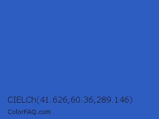 CIELCh 41.626,60.36,289.146 Color is a normal blue color and the nearest color is Cerulean Blue #2a52be. Hex code #2e5dc1 and RGB value is rgb(46,93,193). In RGB color space, this color is composed of 18% red, 36% green, 76% blue, In CMYK color space, this color is composed of 76% cyan, 52% magenta, 0% yellow , 24% black , In HSL color space, this color has a hue angle of 221° , 62% saturation and 47% lightness.