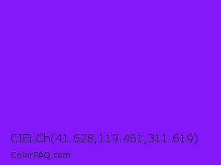 CIELCh 41.628,119.461,311.619 Color is a normal violet color and the nearest color is Violet Color Wheel #7f00ff. Hex code #8217fa and RGB value is rgb(130,23,250). In RGB color space, this color is composed of 51% red, 9% green, 98% blue, In CMYK color space, this color is composed of 48% cyan, 91% magenta, 0% yellow , 2% black , In HSL color space, this color has a hue angle of 268° , 96% saturation and 54% lightness.