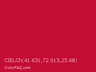 CIELCh 41.631,72.613,25.68 Color is a normal red color and the nearest color is Red NCS #c40233. Hex code #c40d33 and RGB value is rgb(196,13,51). In RGB color space, this color is composed of 77% red, 5% green, 20% blue, In CMYK color space, this color is composed of 0% cyan, 93% magenta, 74% yellow , 23% black , In HSL color space, this color has a hue angle of 348° , 88% saturation and 41% lightness.