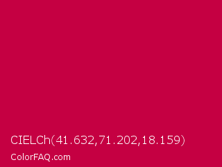 CIELCh 41.632,71.202,18.159 Color is a normal rose color and the nearest color is Spanish Carmine #d10047. Hex code #c50042 and RGB value is rgb(197,0,66). In RGB color space, this color is composed of 77% red, 0% green, 26% blue, In CMYK color space, this color is composed of 0% cyan, 100% magenta, 66% yellow , 23% black , In HSL color space, this color has a hue angle of 340° , 100% saturation and 39% lightness.
