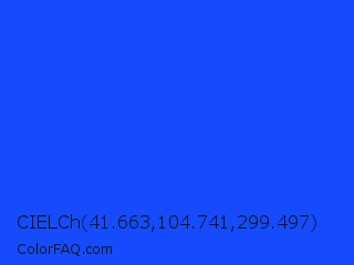 CIELCh 41.663,104.741,299.497 Color is a normal blue color and the nearest color is Blue RYB #0247fe. Hex code #154bfd and RGB value is rgb(21,75,253). In RGB color space, this color is composed of 8% red, 29% green, 99% blue, In CMYK color space, this color is composed of 92% cyan, 70% magenta, 0% yellow , 1% black , In HSL color space, this color has a hue angle of 226° , 98% saturation and 54% lightness.