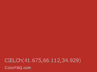 CIELCh 41.675,66.112,34.929 Color is a normal red color and the nearest color is Tall Poppy #b32d29. Hex code #b82e27 and RGB value is rgb(184,46,39). In RGB color space, this color is composed of 72% red, 18% green, 15% blue, In CMYK color space, this color is composed of 0% cyan, 75% magenta, 79% yellow , 28% black , In HSL color space, this color has a hue angle of 3° , 65% saturation and 44% lightness.