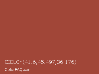 CIELCh 41.6,45.497,36.176 Color is a normal red color and the nearest color is Chestnut #954535. Hex code #a14638 and RGB value is rgb(161,70,56). In RGB color space, this color is composed of 63% red, 27% green, 22% blue, In CMYK color space, this color is composed of 0% cyan, 57% magenta, 65% yellow , 37% black , In HSL color space, this color has a hue angle of 8° , 48% saturation and 43% lightness.