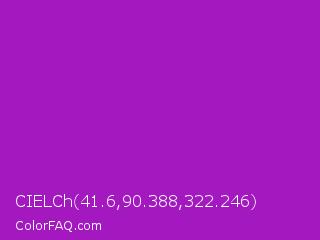 CIELCh 41.6,90.388,322.246 Color is a normal purple color and the nearest color is Purple Munsell #9f00c5. Hex code #a319bf and RGB value is rgb(163,25,191). In RGB color space, this color is composed of 64% red, 10% green, 75% blue, In CMYK color space, this color is composed of 15% cyan, 87% magenta, 0% yellow , 25% black , In HSL color space, this color has a hue angle of 290° , 77% saturation and 42% lightness.