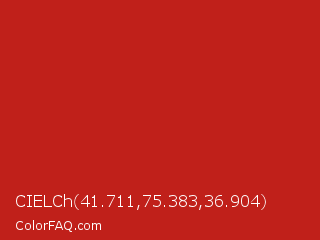 CIELCh 41.711,75.383,36.904 Color is a normal red color and the nearest color is Thunderbird #c02b18. Hex code #c0201a and RGB value is rgb(192,32,26). In RGB color space, this color is composed of 75% red, 13% green, 10% blue, In CMYK color space, this color is composed of 0% cyan, 83% magenta, 86% yellow , 25% black , In HSL color space, this color has a hue angle of 2° , 76% saturation and 43% lightness.