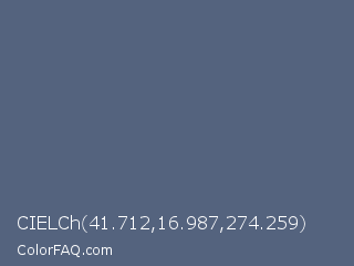 CIELCh 41.712,16.987,274.259 Color is a normal blue color and the nearest color is Paynes Grey #536878. Hex code #54637e and RGB value is rgb(84,99,126). In RGB color space, this color is composed of 33% red, 39% green, 49% blue, In CMYK color space, this color is composed of 33% cyan, 21% magenta, 0% yellow , 51% black , In HSL color space, this color has a hue angle of 219° , 20% saturation and 41% lightness.
