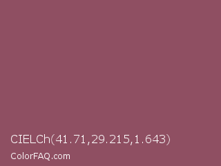 CIELCh 41.71,29.215,1.643 Color is a normal rose color and the nearest color is Twilight Lavender #8a496b. Hex code #8f4f62 and RGB value is rgb(143,79,98). In RGB color space, this color is composed of 56% red, 31% green, 38% blue, In CMYK color space, this color is composed of 0% cyan, 45% magenta, 31% yellow , 44% black , In HSL color space, this color has a hue angle of 342° , 29% saturation and 44% lightness.