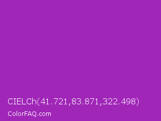 CIELCh 41.721,83.871,322.498 Color is a normal purple color and the nearest color is Dark Orchid #9932cc. Hex code #a026b8 and RGB value is rgb(160,38,184). In RGB color space, this color is composed of 63% red, 15% green, 72% blue, In CMYK color space, this color is composed of 13% cyan, 79% magenta, 0% yellow , 28% black , In HSL color space, this color has a hue angle of 290° , 66% saturation and 44% lightness.