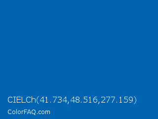 CIELCh 41.734,48.516,277.159 Color is a normal blue color and the nearest color is Honolulu Blue #006db0. Hex code #0064b2 and RGB value is rgb(0,100,178). In RGB color space, this color is composed of 0% red, 39% green, 70% blue, In CMYK color space, this color is composed of 100% cyan, 44% magenta, 0% yellow , 30% black , In HSL color space, this color has a hue angle of 206° , 100% saturation and 35% lightness.