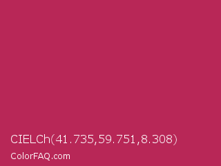 CIELCh 41.735,59.751,8.308 Color is a normal rose color and the nearest color is Rose Red #c21e56. Hex code #b82757 and RGB value is rgb(184,39,87). In RGB color space, this color is composed of 72% red, 15% green, 34% blue, In CMYK color space, this color is composed of 0% cyan, 79% magenta, 53% yellow , 28% black , In HSL color space, this color has a hue angle of 340° , 65% saturation and 44% lightness.