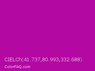 CIELCh 41.737,80.993,332.688 Color is a normal magenta color and the nearest color is Violet Eggplant #991199. Hex code #b308a1 and RGB value is rgb(179,8,161). In RGB color space, this color is composed of 70% red, 3% green, 63% blue, In CMYK color space, this color is composed of 0% cyan, 96% magenta, 10% yellow , 30% black , In HSL color space, this color has a hue angle of 306° , 91% saturation and 37% lightness.