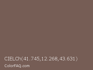 CIELCh 41.745,12.268,43.631 Color is a normal color and the nearest color is Russett #755a57. Hex code #765d55 and RGB value is rgb(118,93,85). In RGB color space, this color is composed of 46% red, 36% green, 33% blue, In CMYK color space, this color is composed of 0% cyan, 21% magenta, 28% yellow , 54% black , In HSL color space, this color has a hue angle of 15° , 16% saturation and 40% lightness.