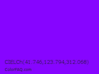 CIELCh 41.746,123.794,312.068 Color is a normal purple color and the nearest color is Violet Color Wheel #7f00ff. Hex code #8506ff and RGB value is rgb(133,6,255). In RGB color space, this color is composed of 52% red, 2% green, 100% blue, In CMYK color space, this color is composed of 48% cyan, 98% magenta, 0% yellow , 0% black , In HSL color space, this color has a hue angle of 271° , 100% saturation and 51% lightness.