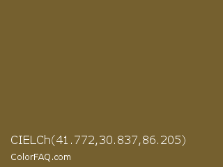 CIELCh 41.772,30.837,86.205 Color is a normal orange color and the nearest color is Yellow Metal #716338. Hex code #75602f and RGB value is rgb(117,96,47). In RGB color space, this color is composed of 46% red, 38% green, 18% blue, In CMYK color space, this color is composed of 0% cyan, 18% magenta, 60% yellow , 54% black , In HSL color space, this color has a hue angle of 42° , 43% saturation and 32% lightness.