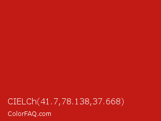 CIELCh 41.7,78.138,37.668 Color is a normal red color and the nearest color is International Orange Engineering #ba160c. Hex code #c21b15 and RGB value is rgb(194,27,21). In RGB color space, this color is composed of 76% red, 11% green, 8% blue, In CMYK color space, this color is composed of 0% cyan, 86% magenta, 89% yellow , 24% black , In HSL color space, this color has a hue angle of 2° , 80% saturation and 42% lightness.